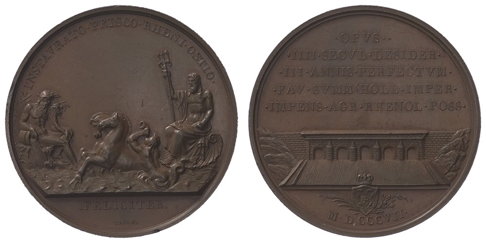 voorzijde: in een omschrift zit rechts Neptunus met drietand in zijn rechterhand, naar links gewend, op zijn strijd- of zegewagen, getrokken door twee paarden naar links. Naast de paarden zwemt een triton met hoorn. Links zit de God van de Rijn naar rechts gewend op een zetel, met in zijn linkerhand een hoorn des overvloeds en met zijn rechterhand steunend op een leegstromende waterkruik. In de afsnede een opschrift en een signatuur.