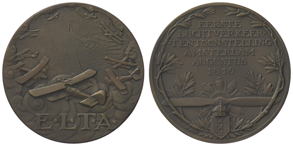 keerzijde: omgeven door een krans van lauwertakken een opschrift waaronder een vliegtuigmotor met propellor. Daaronder het gekroonde wapen van Amsterdam. Rechtsonder initialen.