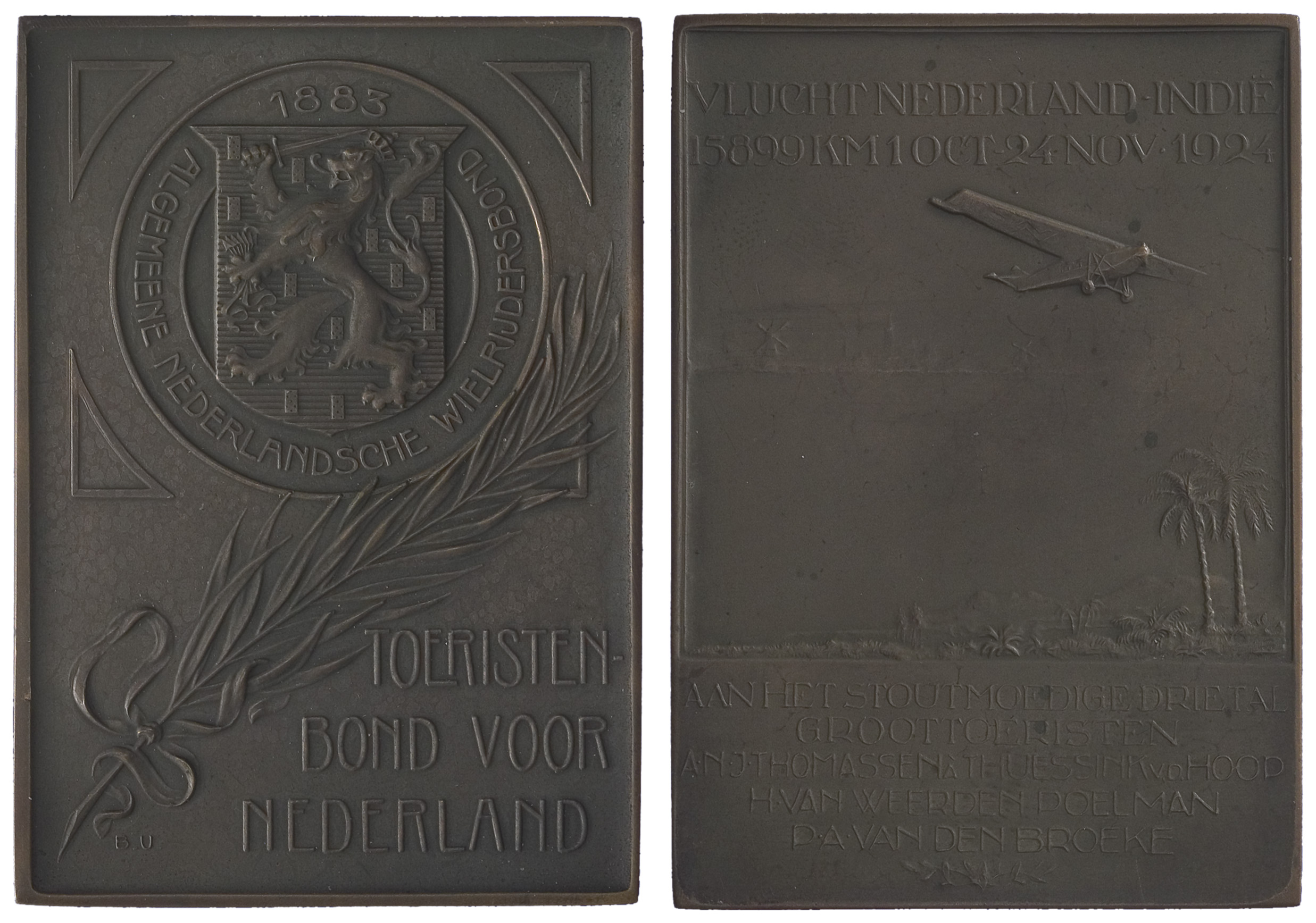 opschrift keerzijde onder: AAN HET STOUTMOEDIGE DRIETAL / GROOTTOERISTEN A.N.J.THOMASSEN A THUESSINK V.D.HOOP / H. VAN WEERDEN POELMAN / P.A. VAN DEN BROEKE.