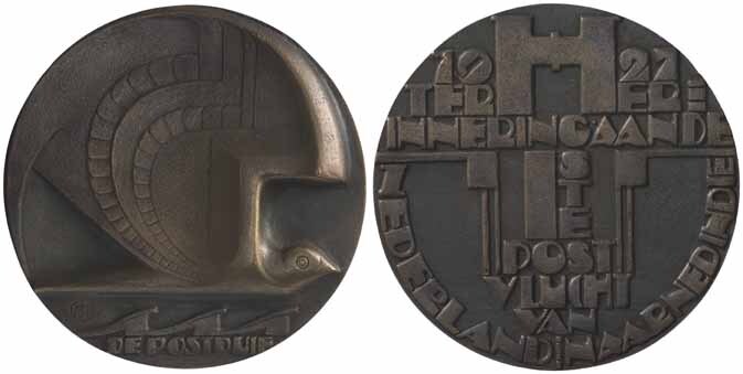 voorzijde: een naar rechts vliegende gestyleerde duif boven gestyleerde golven, waaronder een opschrift. Links van het opschrift een signatuur in de vorm van een monogram.