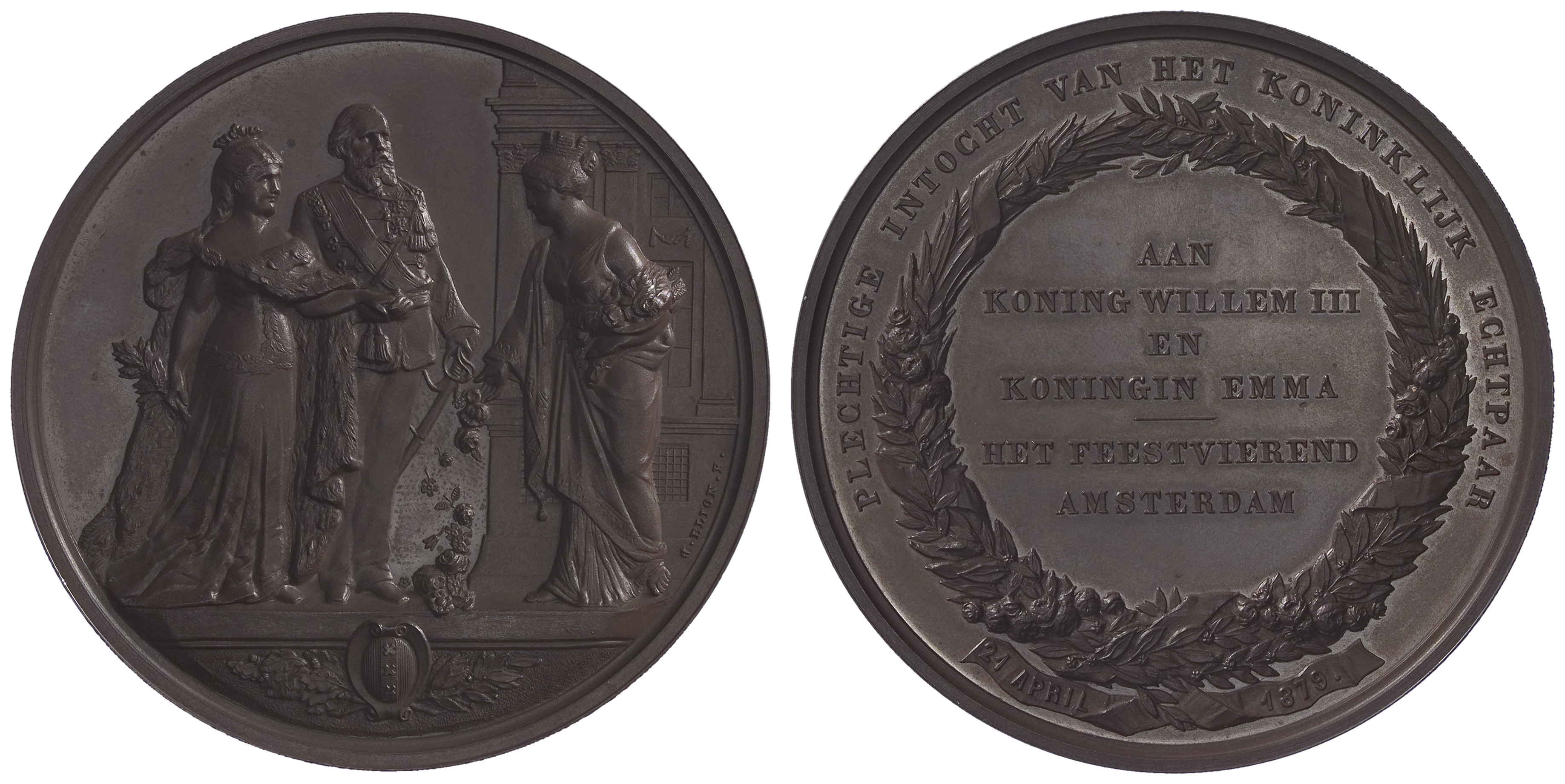 opschrift keerzijde: AAN / KONING WILLEM III / EN / KONINGIN EMMA / HET FEESTVIEREND / AMSTERDAM