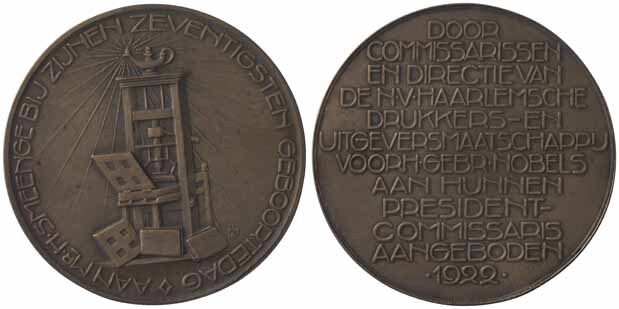 opschrift keerzijde: DOOR / COMMISSARISSEN / EN DIRECTIE VAN / DE N.V.HAARLEMSCHE / DRUKKERS- EN / UITGEVERSMAATSCHAPPIJ / VOORH. GEBR. NOBELS / AAN HUNNEN / PRESIDENT- / COMMISSARIS / AANGEBODEN / .1922.