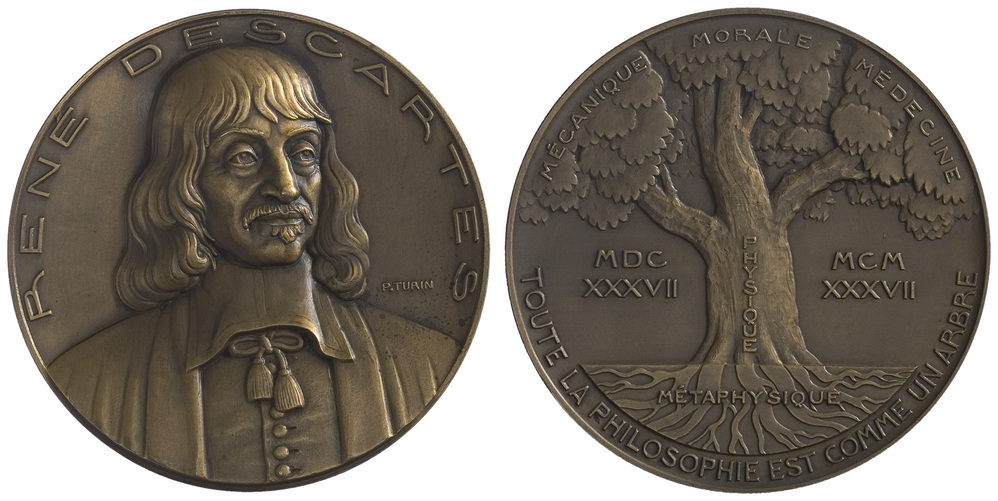 voorzijde: borstbeeld van Rneé Descartes, rechts daarvan een signatuur.