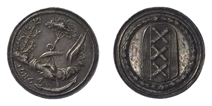 keerzijde: een gevleugelde arm rechts waarvan de hand op het anker van de hoop aan een behoeftige de hand drukt boven het jaartal 1586; bovenaan het oog van God. Links het zinnebeeld van de koophandel.