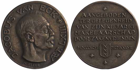 opschrift keerzijde: AANGEBODEN / TER GELEGENHEID / VAN ZIJN XL JARIG / MAKELAARSCHAP / DOOR ZAKENVRIENDEN / MDCCCXCVII / MCMXXXVIII
