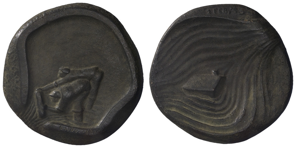 voorzijde: huis omgeven door water in reliëf, hierboven datum. keerzijde: twee dijkwerkers die een gat dichten in de dijk in reliëf, met signatuur en datum.- Trefwoorden