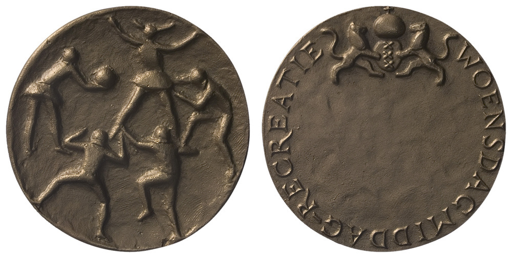 voorzijde: vijf jongelui, drie jongens en twee meisjes, bezig met een balspel. keerzijde: in een omschrift het stadswapen van Amsterdam, gehouden door twee leeuwen rond een leeg veld.- Trefwoorden
