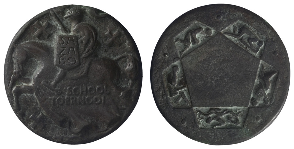 voorzijde: een geharnaste ruiter met zwaard en schild te paard met schabrak (dekkleed). Verspreid op de voorzijde de drie Andrieskruizen. Op het schild de afkorting SA ZA BO (Samenwerkende Zaalsport Bonden) en op het dekkleed een opschrift.