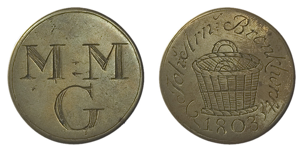 voorzijde: een rieten mand met een omschrift en jaartal. Cirkelgroef. keerzijde: de letters MMG en een cirkelgroef.- Trefwoorden