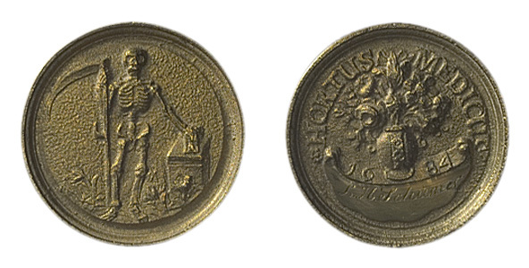 voorzijde: een geraamte, en face, in zijn rechterhand een zeis. Zijn linkerhand rust op een zandloper, geplaatst op een altaar.