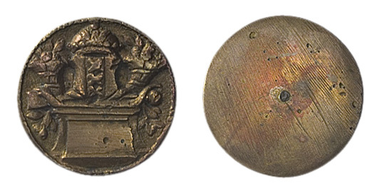 éénzijdige penning, het gekroonde wapen van Amsterdam geflankeerd door twee hoorns van overvloed, op een voetstuk, waarop een leeg veld.- Trefwoorden