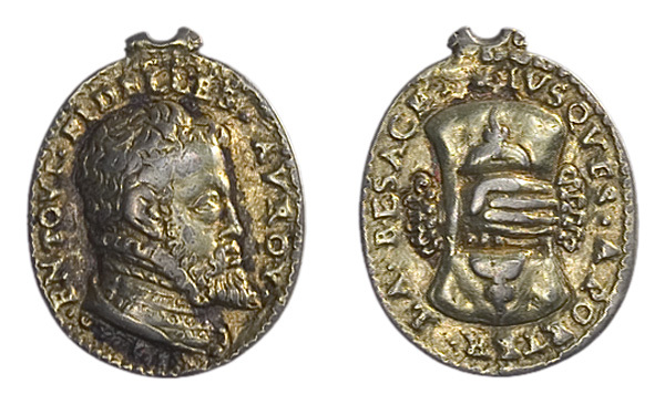 voorzijde: omschrift met naar rechts gewend hoofd van Filips II van Spanje. Bovenaan de penning een afgebroken draagoogje in de vorm van een bloem.