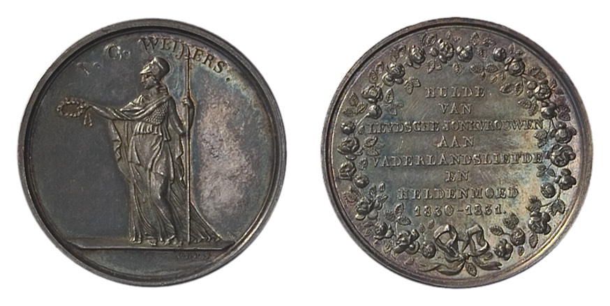 opschrift keerzijde: HULDE / VAN / LEYDSCHE JONKVROUWEN / AAN / VADERLANDSLIEFDE / EN / HELDENMOED / 1830-1831.