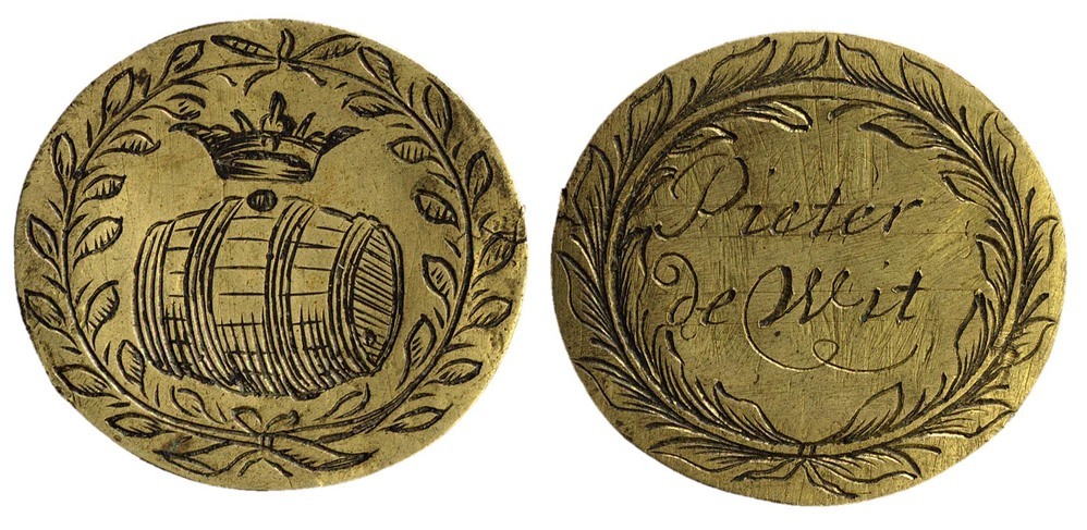 voorzijde: een gekroond biervat, omgeven door een lauwerkrans. keerzijde: een signatuur omgeven door een lauwerkrans.- Trefwoorden