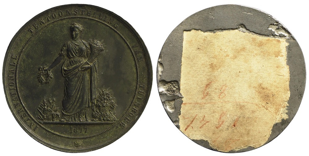 voorzijde: éénzijdige penning met een staande Flora 'en face', die een gestrikte krans uit met haar rechterhand schuin naar beneden, en heeft een hoorn met bloemen in haar linkerarm. Aan haar linkerzijde staat een mand met bloemen op de grond en ook aan haar rechterzijde staan bloemen. In de afsnede een jaartal. De penning heeft een omschrift met een kabelcirkel.