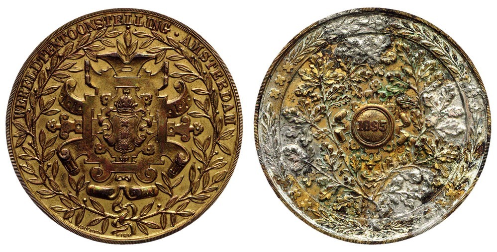 voorzijde: een omschrift waarbinnen een lauwerkrans. Daarbinnen het gekroonde wapen van Amsterdam, omgeven door een veel-armige cartouche. Onder tegen de rand een signatuur.
