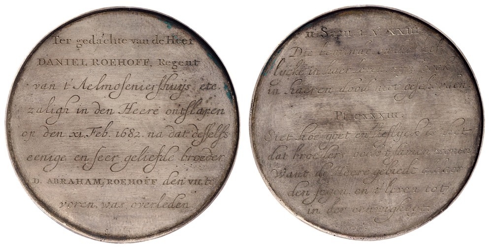opschrift voorzijde: Ter gedachte van de Heer / DANIEL ROEHOFF, Regent / van 't Aelmoseniershuijs etc. / zaligh in den Heere ontslapen / op den XI. Feb. 1682. nadat desselfs / eenige en seer geliefde broeder / D. ABRAHAM ROEHOFF den XII te / voren was overleden.