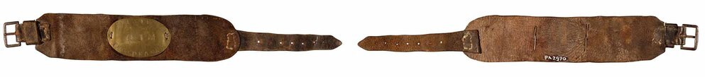 aankoop 1999-05-04 inv.nr. PA 2970 in depot Leren armband met gespsluiting, in het midden een liggend ovaal, koperen draagteken, d.m.v. koperdraad op het leer vastgezet