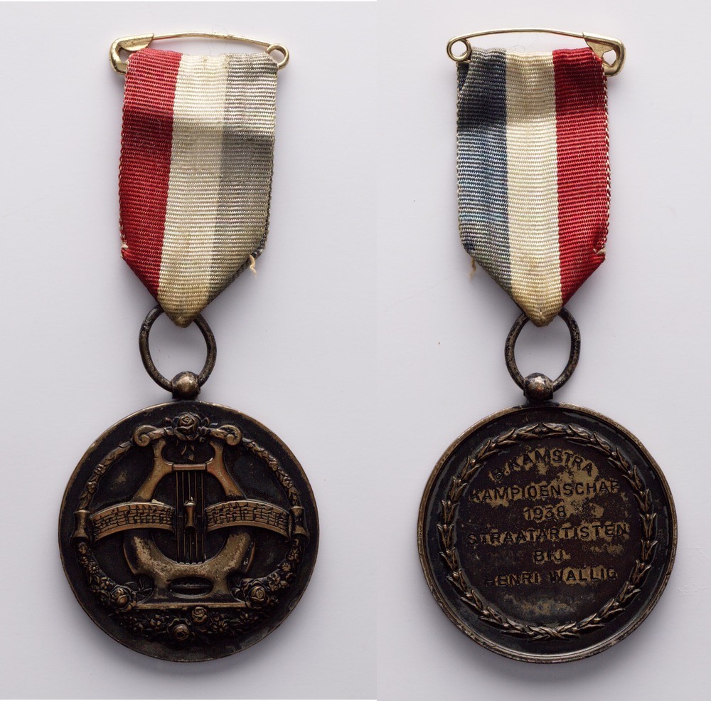 - inscriptie kz: B.KAMSTRA/KAMPIOENSCHAP/1938/STRAATARTISTEN/BIJ HENRI/WALLIG/.