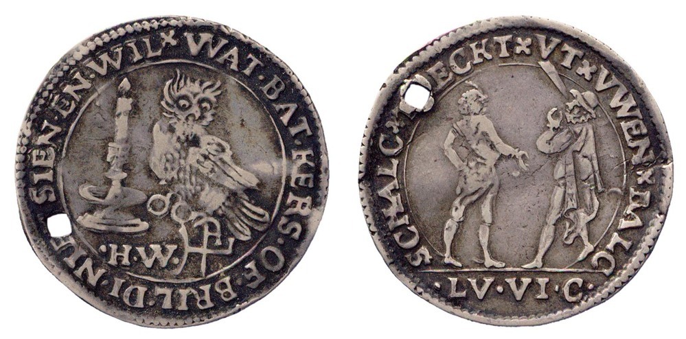keerzijde: een omschrift waarbinnen een uil, een bril en een kaars in een kandelaar. Daaronder de letters H.W. Links van de kandelaar een gat.