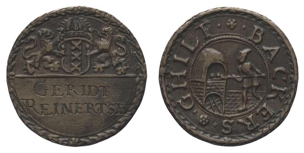 voorzijde: het gekroonde wapen van Amsterdam gehouden door twee leeuwen, waaronder een inscriptie. keerzijde: een bakkerij met omschrift. Aan de bovenzijde doorboord.- Trefwoorden