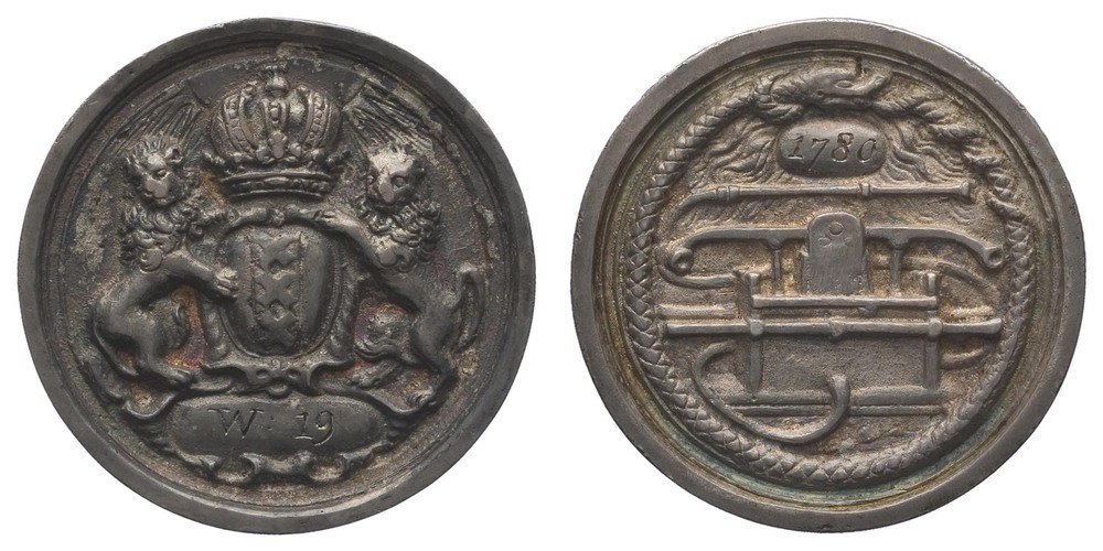 voorzijde: het gekroonde wapen van Amsterdam, gehouden door twee leeuwen. Onder het wapen een veld met W:19