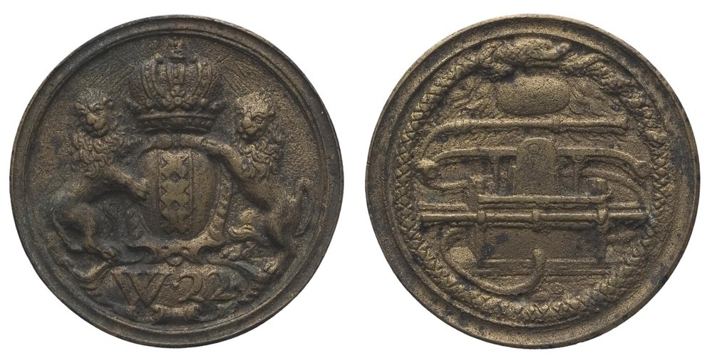 voorzijde: het gekroonde wapen van Amsterdam, gehouden door twee leeuwen. Onder het wapen een veld met de letters W.22. Achter de kroon een stralende zon.