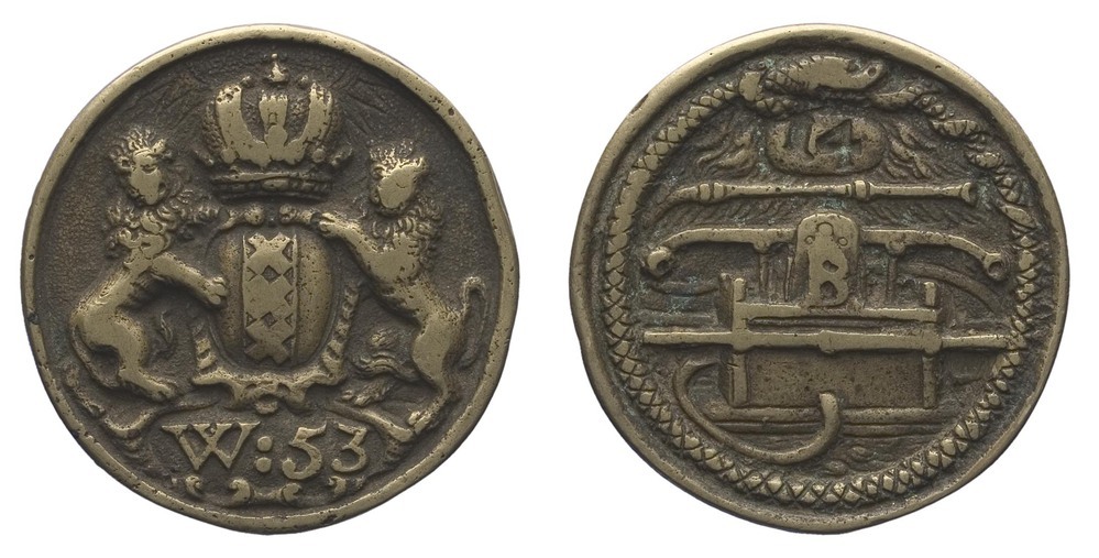 voorzijde: het gekroonde wapen van Amsterdam, gehouden door twee leeuwen. Onder het wapen een veld met de letters W:53 Achter de kroon een stralende zon.
