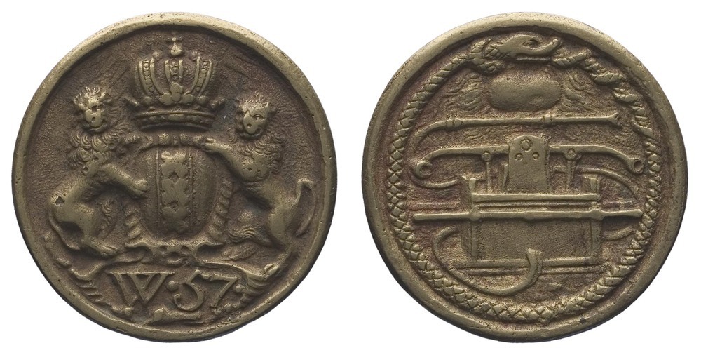 voorzijde: het gekroonde wapen van Amsterdam, gehouden door twee leeuwen. Onder het wapen een veld met W.57. Achter de kroon een stralende zon.