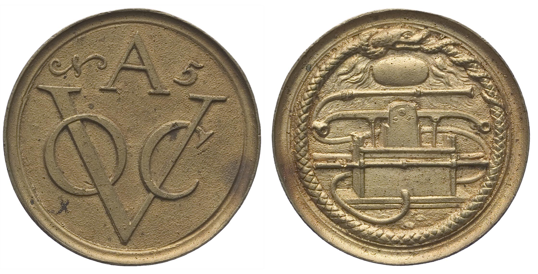 voorzijde: het logo van de Vereenigde Oostindische Compagnie (VOC) waarboven een letter en een nummer (A5). keerzijde: een brandspuit omgeven door een slang (Ouroboros). Bovenin een leeg ovaal veld.- Trefwoorden