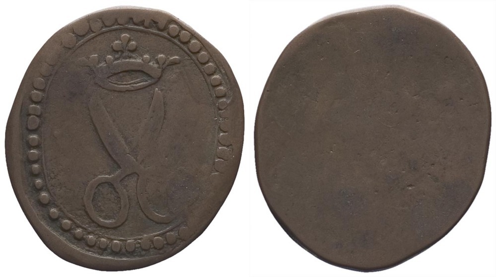 voorzijde: binnen een parelrand een geopende gekroonde schaar. keerzijde: leeg veld.- Trefwoorden