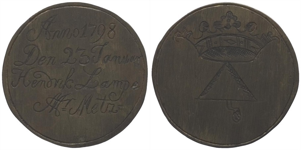 voorzijde: een gekroonde staande loodgoetershamer. Cirkelgroef. (Verkeerde afbeelding). keerzijde: signatuur en datum. Cirkelgroef.