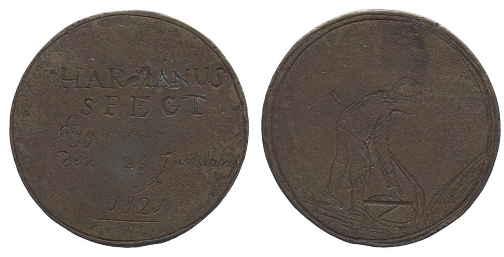 voorzijde: binnen een cirkelgroef een naar rechts gebogen man met in zijn rechterhand een aan zijn voeten staande korenmaat en strijkel, in zijn linkerhand een schep met lange steel. keerzijde: binnen een cirkelgroef een signatuur en datum.