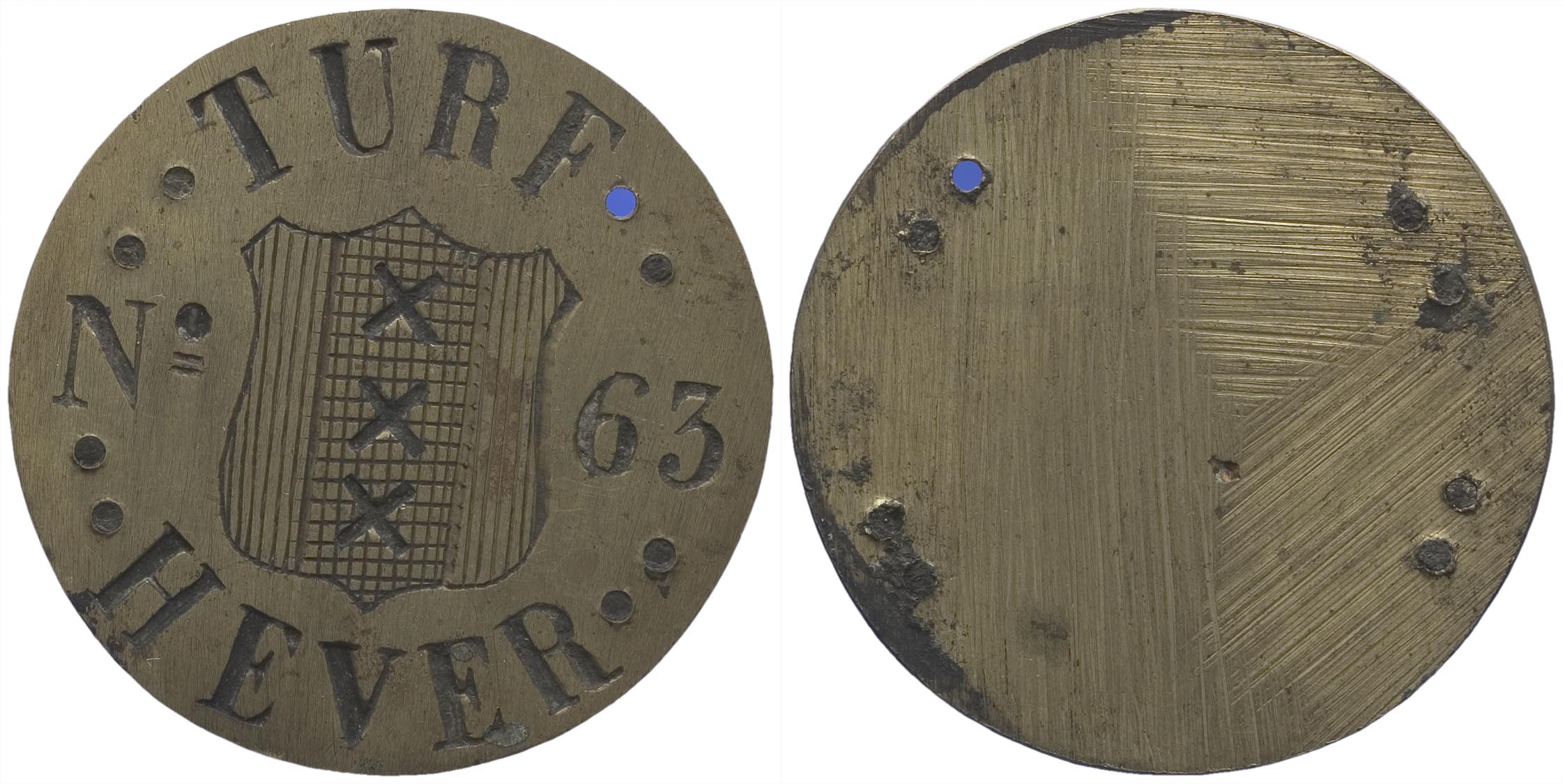voorzijde: de plaat is eenzijdig gegraveerd met het wapen van Amsterdam. Aan linkerzijde van wapenschild: No.; aan rechterzijde: 63; boven wapenschild: TURF; onder wapenschild: HEVER. Tussen deze woorden zijn acht gaatjes geslagen.