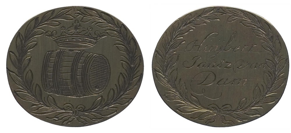 voorzijde: een gekroond biervat, omgeven door een gestrikte lauwerkrans. keerzijde: een signatuur omgeven door een gestrikte lauwerkrans.- Trefwoorden
