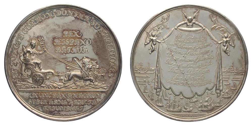 opschrift keerzijde: Pacis Felicitas / ad Ubrumq’ Solem, / Ubrumq’ Oceanum, / Terra Mariq’ Parta, / Perpetuae Tranquil- / litatis Publicae / Spe et Voto / Anno M . D . C . xlviii.