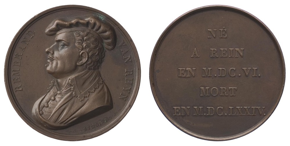 voorzijde: in een omschrift het borstbeeld van Rembrandt van Rijn en profil naar links met baret op het hoofd.