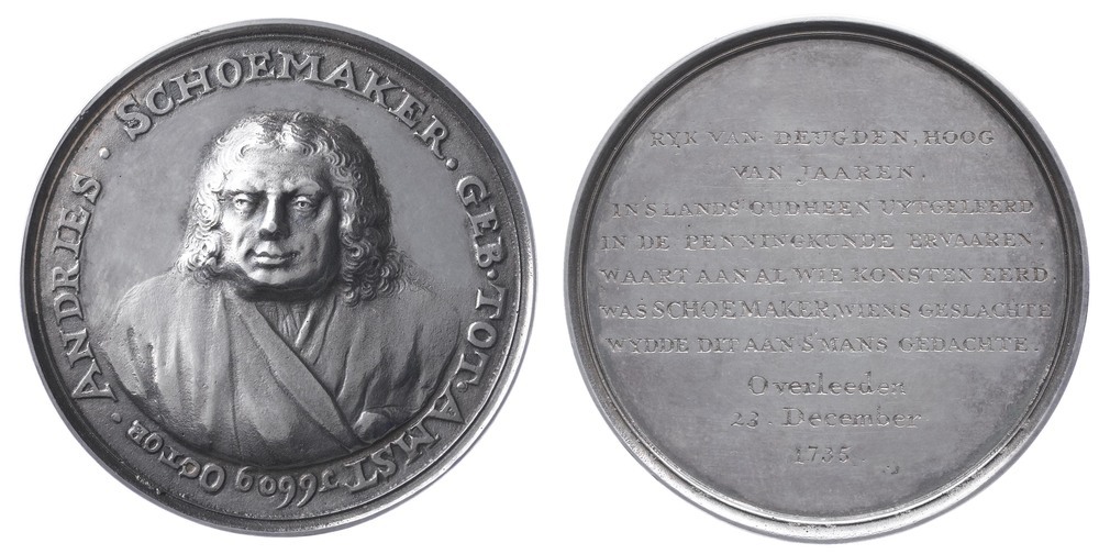 opschrift keerzijde: ryk van deugden, hoog / van jaaren / in 's lands oudheen uytgeleerd / in de penningkunde ervaaren, / waar aan al wie konsten eerd / was Schoemaker, wiens geslachte / wydde dit aan s'mans gedachte / Overleeden / 23. December / 1735