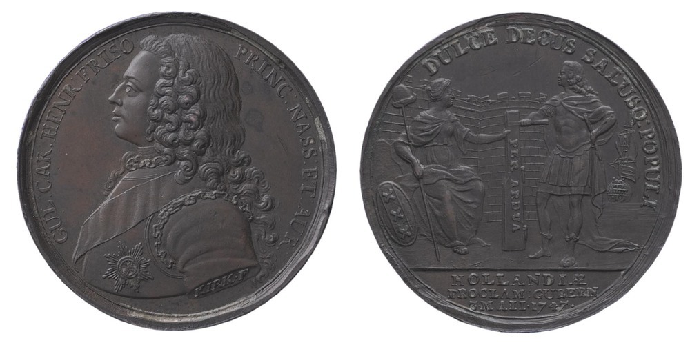 opschrift keerzijde in de afsnede: HOLLANDIAE / PROCLAIM:GUBERN: / 3 MAII.1747.