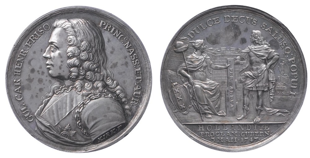 opschrift keerzijde in de afsnede: HOLLANDIAE / PROCLAIM:GUBERN: / 3 MAII.1747.