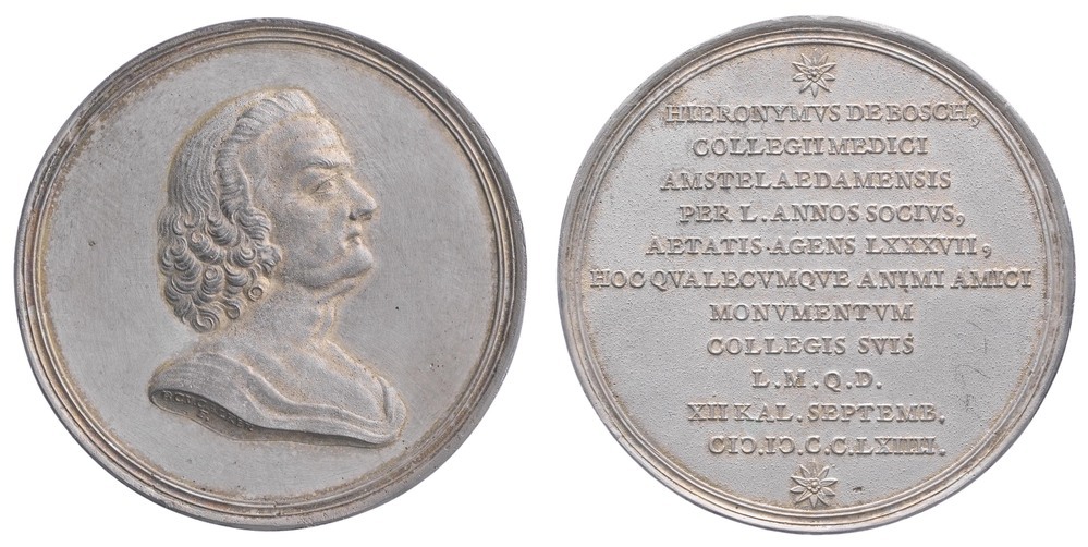 opschrift keerzijde: HIERONYMVS DE BOSCH, / COLLEGII MEDICI /AMSTELAEDAMENSIS / PER L. ANNOS SOCIVS, / AETATIS AGENS LXXXVII, / HOC QVALECVMQVE ANIMI AMICI / MONVMENTVM / COLLEGIS SVIS / L.M.Q.D. / XII KAL. SEPTEMB. / CIC.IC.C.C.LXIIII.