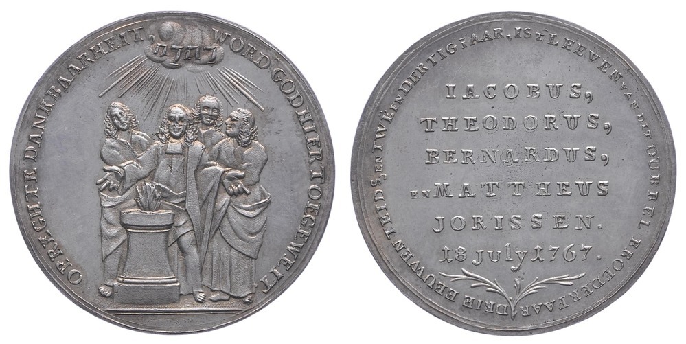 opschrift keerzijde: IACOBUS, / THEODORUS, / BERNARDUS, EN MATTHEUS / JORISSEN. / 18 JULY 1767