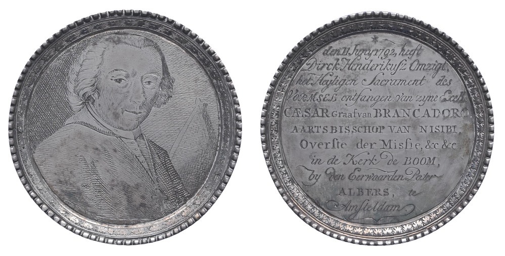 opschrift keerzijde: den 11 Juny 1792, heeft / Dirk Hendrikusz Omzigt, / het Heyligen Sacrament des / VORMSEL ontfangen van zyne Exell / CÆSAR Graaf van BRANCADORO, / AARTSBISSCHOP VAN NISIBI, / Overste der Missie, &c &c / in de Kerk de BOOM, / bij den Eerwaarden Pater / ALBERS, te / Amsteldam.