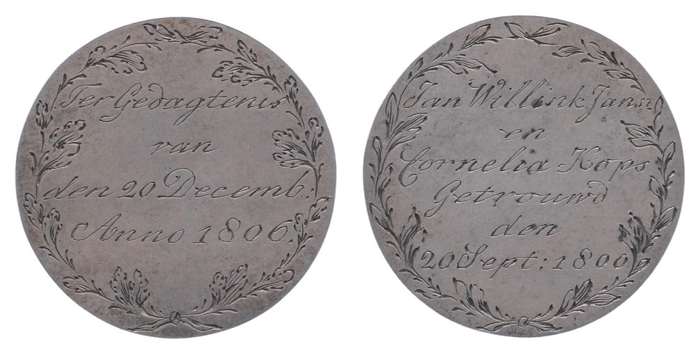 Jan Willink Jansz (1778-1827) was de zoon van Jan Willink en Hester van Lennep. Cornelia Kops (1783-1840) was de dochter van de Haarlemse textielkoopman en -fabrikant Willem Philip Kops en Cornelia de Wolff. In 1806 waren ze 6¼ jaar getrouwd en vierden zij het tinnen huwelijk. Penningen op tinnen huwelijken zijn zeer zeldzaam.