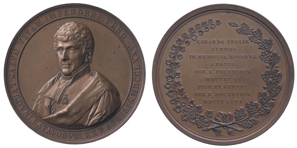 opschrift keerzijde: GERARDO.VROLIK / SVMMOS / IN.MEDICINA.HONORES / ADEPTO / DIE.X.DECEMBRIS / MDCCXCVI / FILII.ET.GENERI / DIE.X.DECEMBRIS / MDCCCXLVI