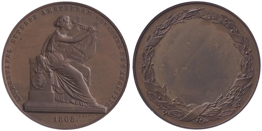 voorzijde: een omschrift waarbinnen een naar rechtsgewende zittende vrouw die een lier bespeelt; op haar zetel het gekroonde wapen van Amsterdam. In de afsnede een jaartal en een signatuur.