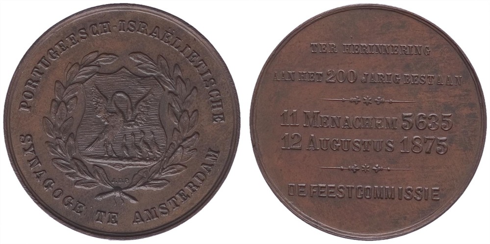 opschrift keerzijde: TER / HERINNERING / AAN HET 200 JARIG BESTAAN / 11 MENACHEM 5635 / 12 AUGUSTUS 1875 / DE FEESTCOMMISSIE