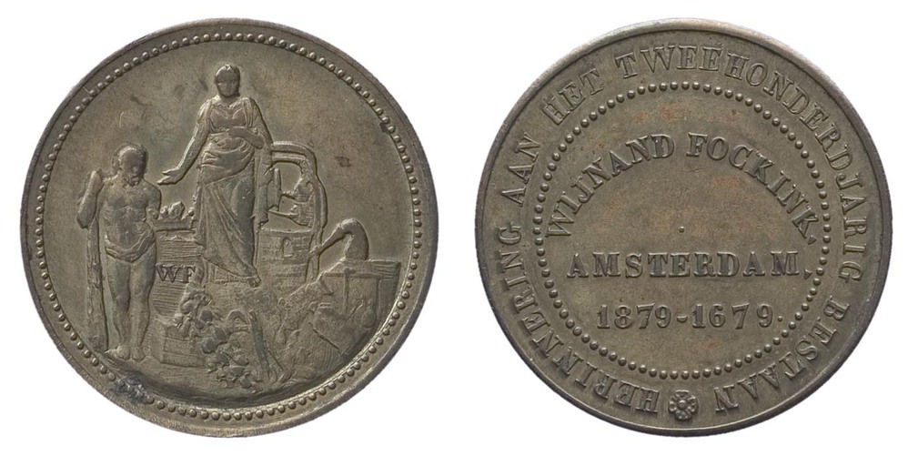 keerzijde: Binnen een parelcirkel de gebogen tekst: WIJNAND FOCKINK. Datonder AMSTERDAM 1879 - 1679. Een omschrift vermeldt: HERINNERING AAN HET TWEEHONDERDJARIG BESTAAN.