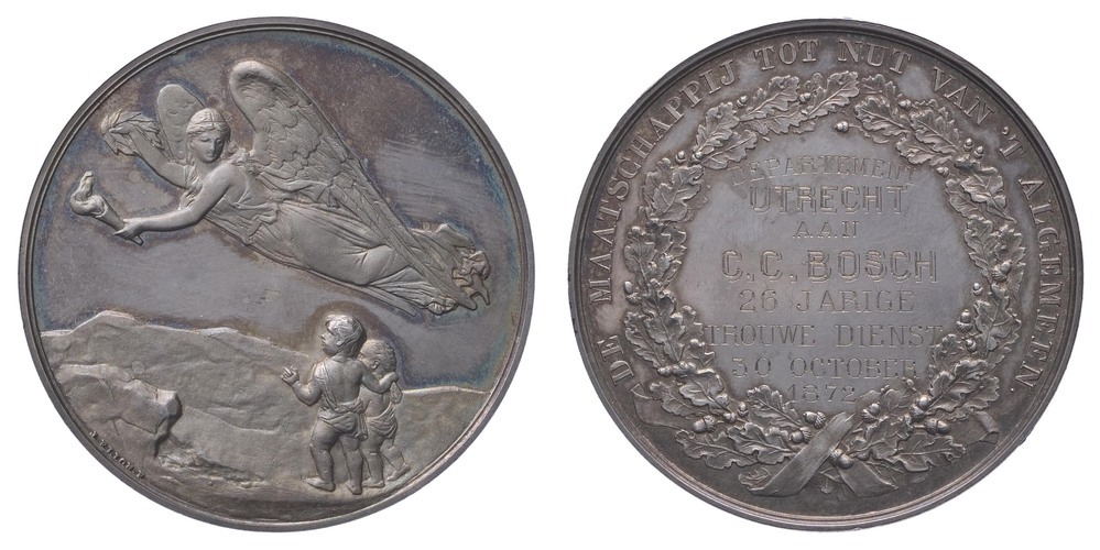 opschrift keerzijde: DEPARTEMENT / UTRECHT / AAN / C.C. BOSCH / 26 JARIGE / TROUWE DIENST / 30 OCTOBER / 1872