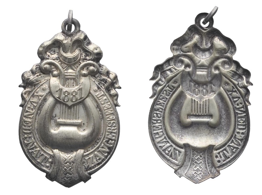 éénzijdige penning in de vorm van een harp met omschrift en jaartal, met onderaan het stadswapen van Amsterdam en bovenaan een kraag met linten. Geheel boven een oog met ring. verso: holle afduk in spiegelbeeld van voorzijde.